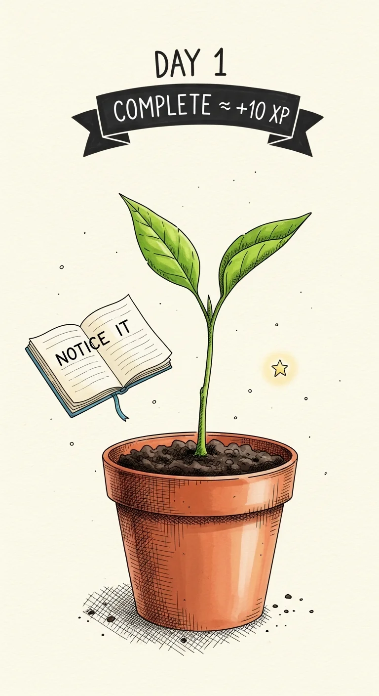 Today's challenge: Notice ONE moment today when you felt comfortable being yourself. Just notice it. Write it down if you can. That's your confidence—it already lives in you. Day 1 complete. +10 XP 🔥