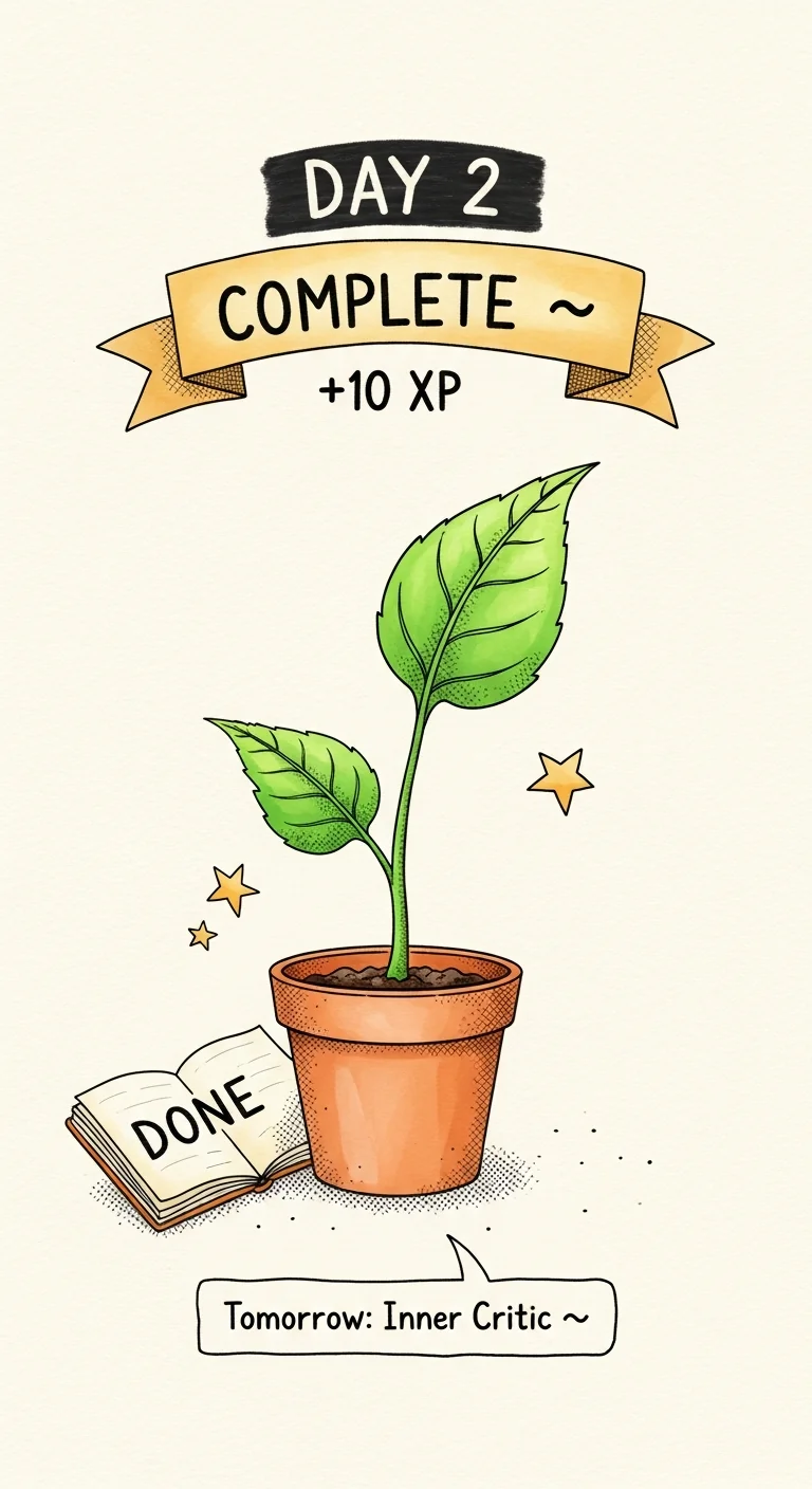 'You're not the center of everyone else's world—and that's actually a relief.' Day 2 complete. Tomorrow: your inner critic vs. your inner friend. +10 XP 🔥🔥