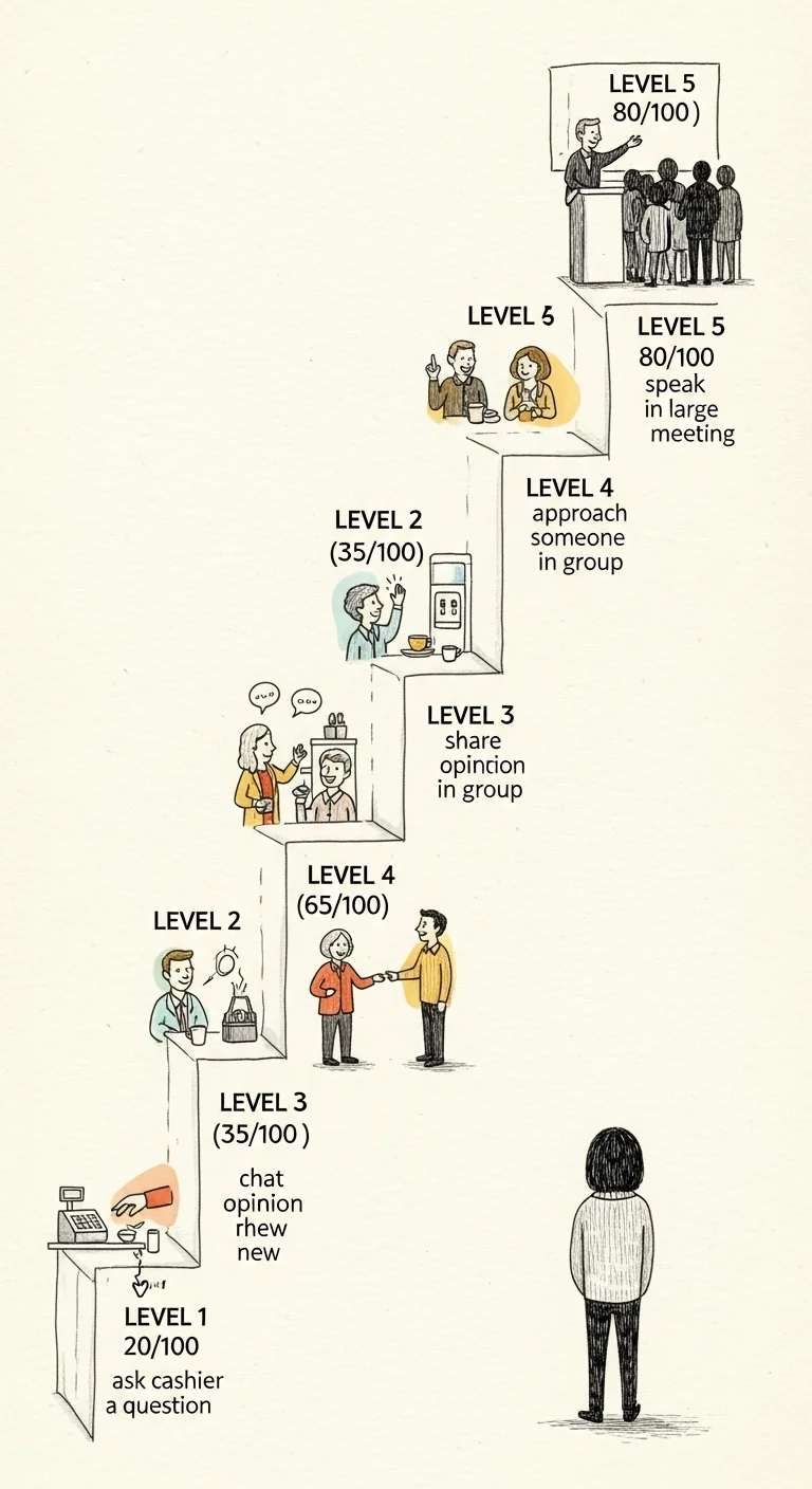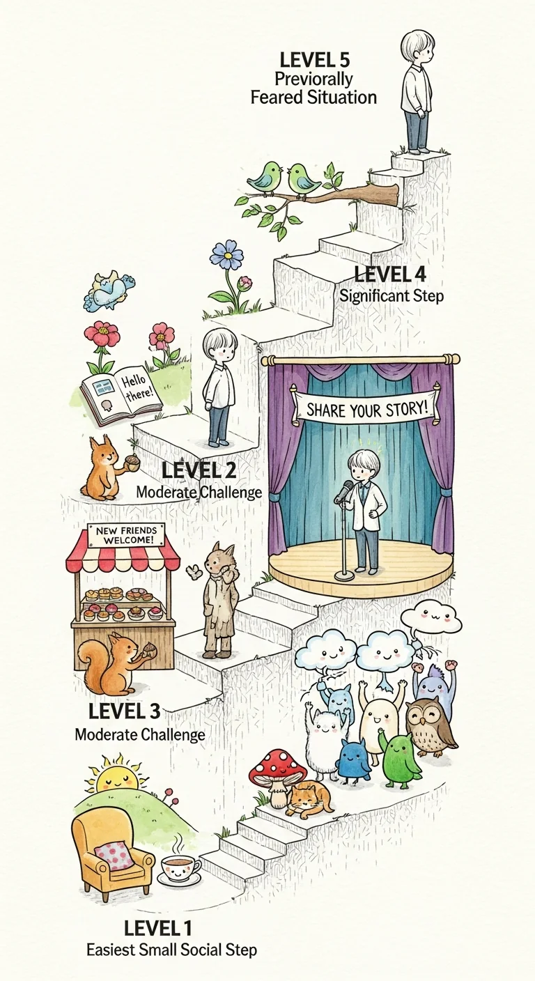 Let's make graduated exposure concrete. First, create a hierarchy of feared social situations arranged from easiest (low anxiety) to hardest (high anxiety). Your goal isn't to conquer level 5—it's to master levels 1-4 so level 5 becomes manageable.