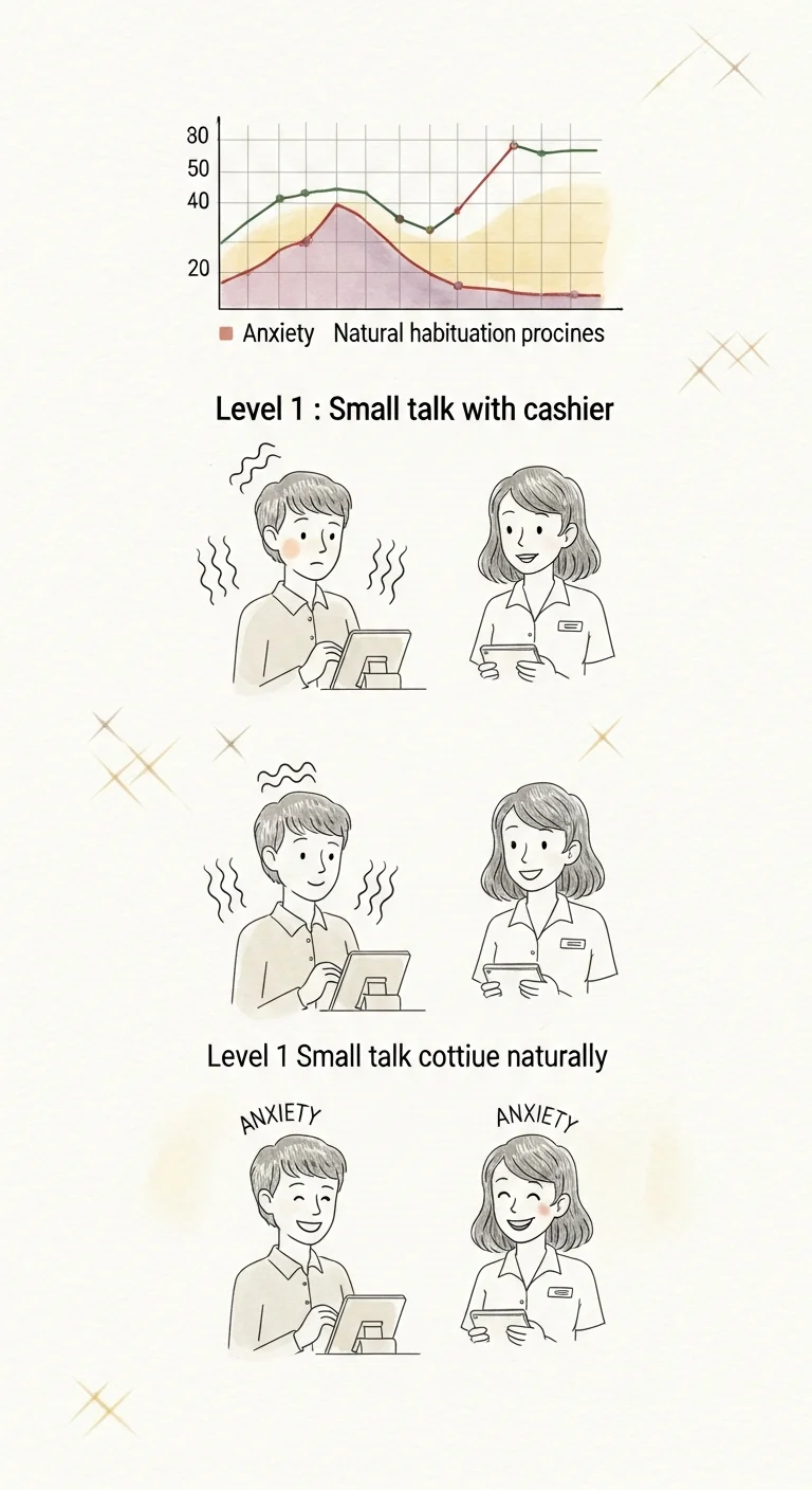 Here's how it works: Start with level 1. Do it. Stay in the situation until your anxiety naturally reduces by 50%. Your body's habituation system will kick in—anxiety decreases with time. Repeat level 1 until it feels manageable.