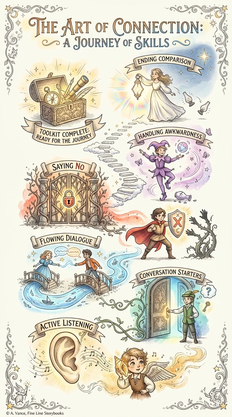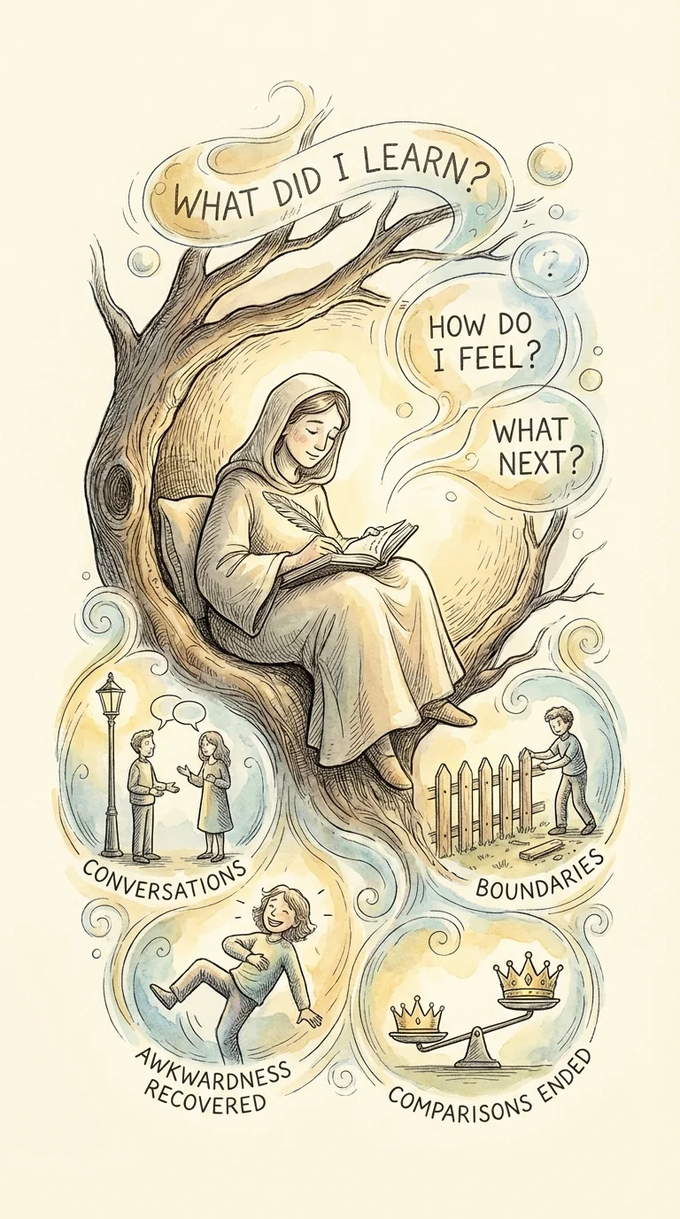 Your Week 2 journey: Day 8—Active Listening taught external focus reduces anxiety. Day 9—Conversation Starters showed simplicity beats cleverness. Day 10—Keeping Conversations Flowing revealed balance and rhythm matter. Day 11—The Power of Saying No proved boundaries build confidence. Day 12—Embracing the Awkward showed recovery matters more than perfection. Day 13—Stop Comparing, Start Connecting freed you from measurement against others.