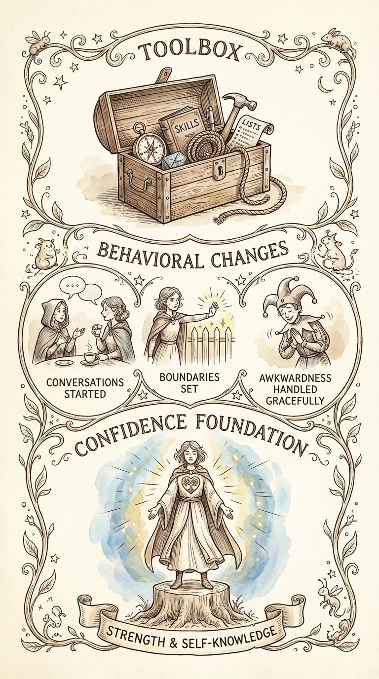 What's actually changed: In your toolbox—you have listening techniques, conversation methods, assertiveness skills, recovery strategies, anti-comparison tools, the 5-second rule, reframing methods, self-compassion. That's a LOT. In your behavior—maybe you started a conversation you'd avoid, said no without excess guilt, recovered from awkwardness faster, used active listening successfully. These aren't accidents—they're skills you practiced. In your confidence—you've shown up 14 days straight, tried things outside your comfort zone, proven you can learn and grow.