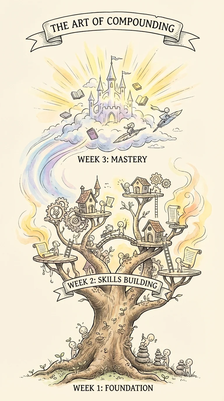The compounding effect is real. Week 1's foundation enabled Week 2's skills. Week 2's skills will enable Week 3's mastery. You're building momentum with small consistent actions compounding into major transformation. You can feel it now. The difference between Day 1 and Day 14 isn't subtle. It's real. You're not the same person.