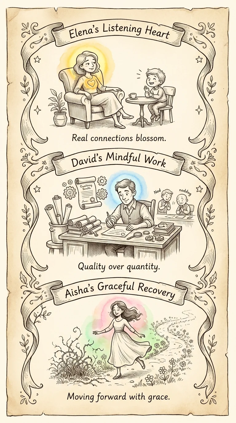 Your Level 2 Journey—Week 2 real reflections. Elena: 'The active listening thing completely changed my conversations. I used to panic about what to say next. Now I just listen. Ask follow-up questions. People keep telling me I'm a great conversationalist.' David: 'I said no to extra work. Felt terrifying. But my boss respected it. And my work quality improved because I wasn't spread thin. Boundaries work.' Aisha: 'I had an awkward moment that would have spiraled for days. Now I recover fast. That's the biggest change.'