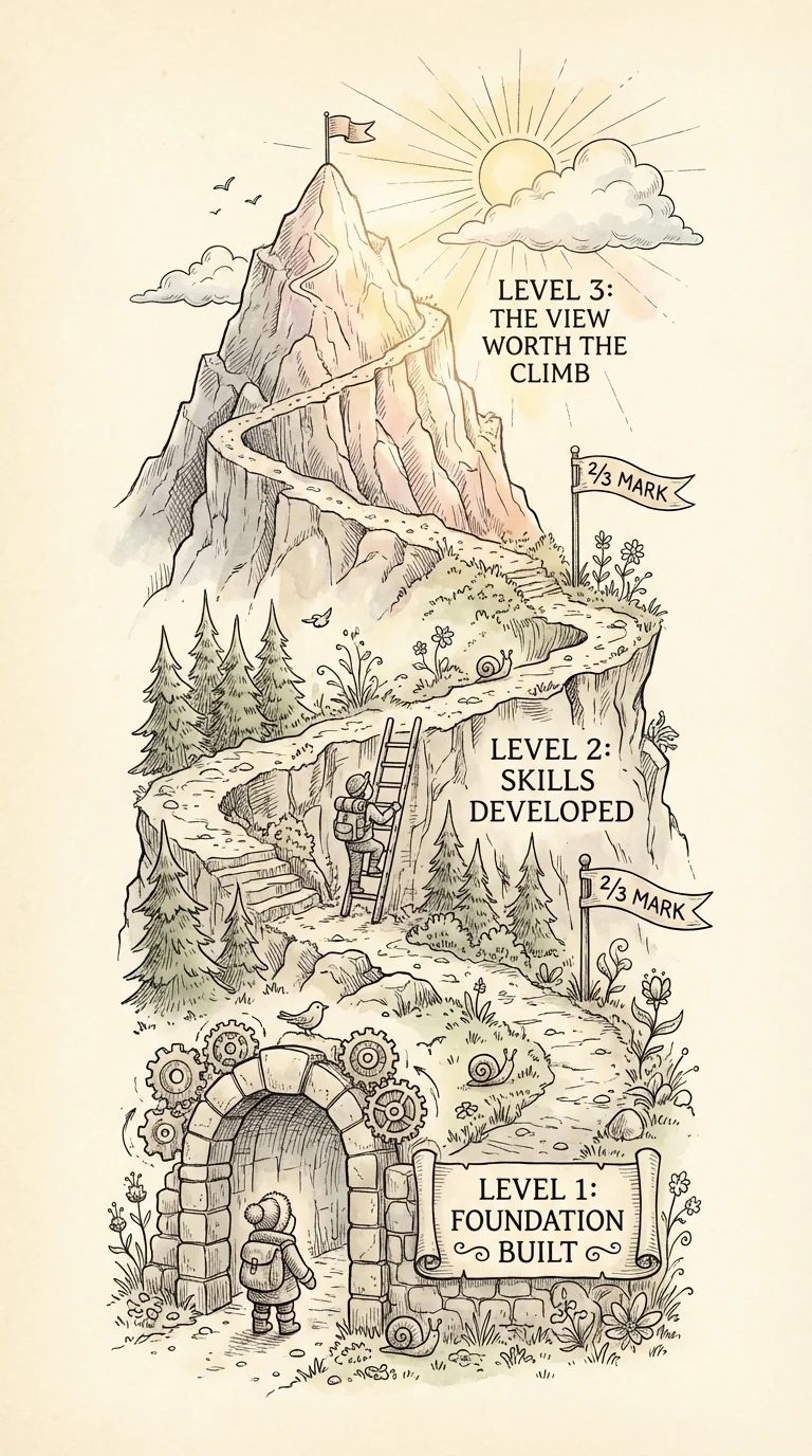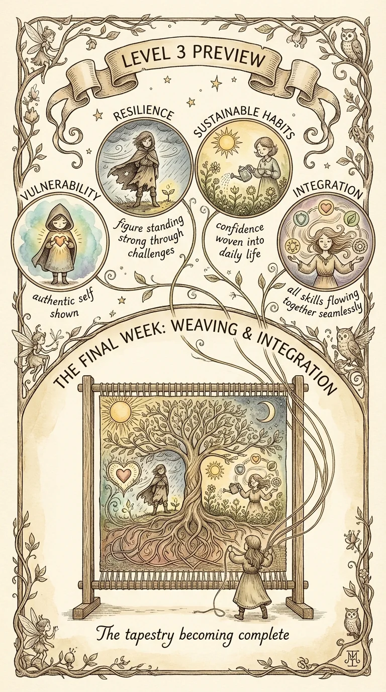You're 2/3 done with the full 21-day journey. That phrase—2/3 done—is powerful. You've already proven you can do this. You have 7 days left. Seven more days of showing up. Seven more days to integrate everything and build mastery. You've climbed 2/3 of the mountain. The final push is ahead. The view from the top? That's Level 3. That's where sustainable, authentic confidence lives.