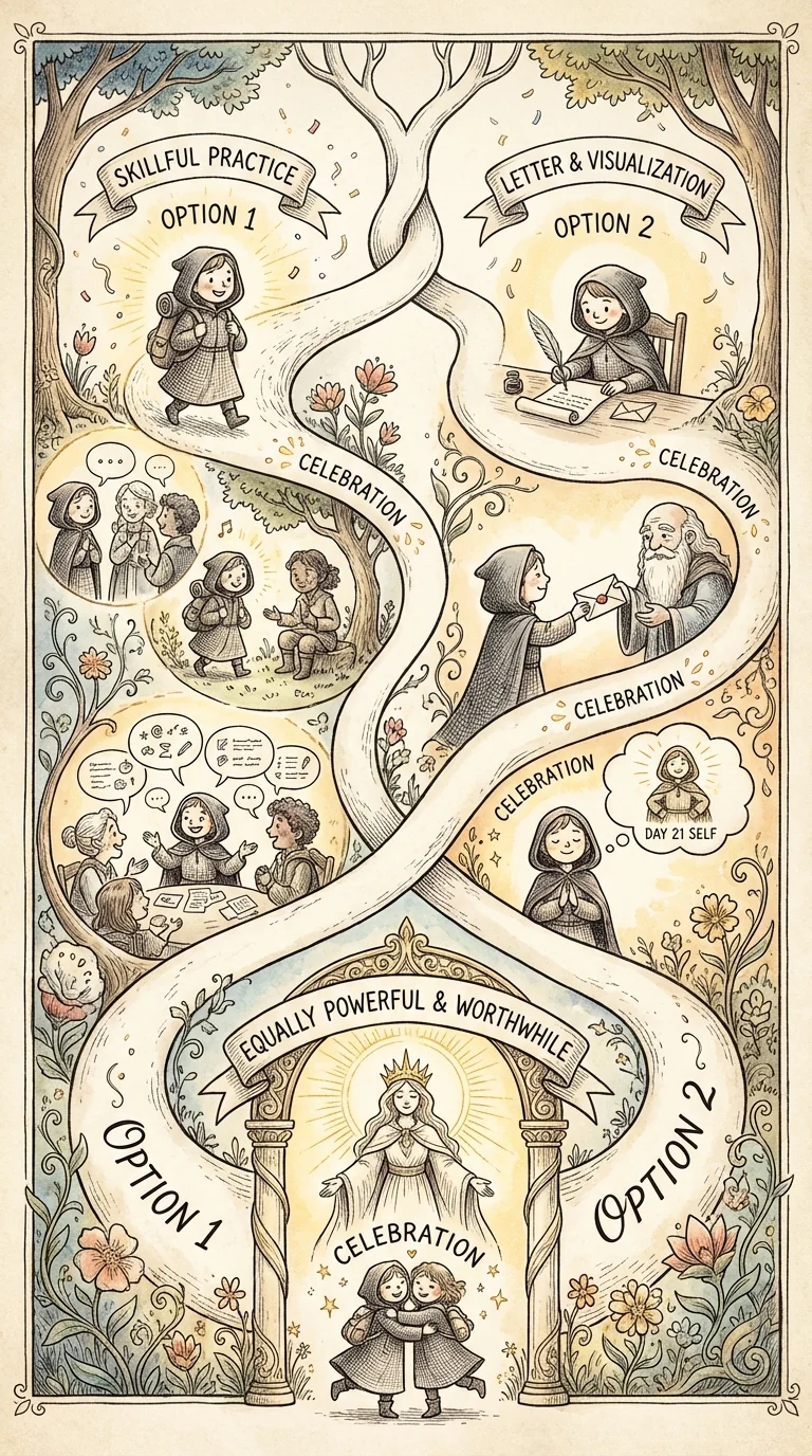 Your practice for today: Option 1—Skill Showcase: Practice THREE skills from Level 2 in real interactions today (example: start conversation + listen actively + graceful exit). Option 2—Celebration + Vision: Write yourself a letter acknowledging your 14-day journey. Share one insight with someone you trust. Visualize yourself at Day 21: even more confident, skilled, resilient. Either way: Celebrate your 14-day streak. This is a real milestone. Honor it.