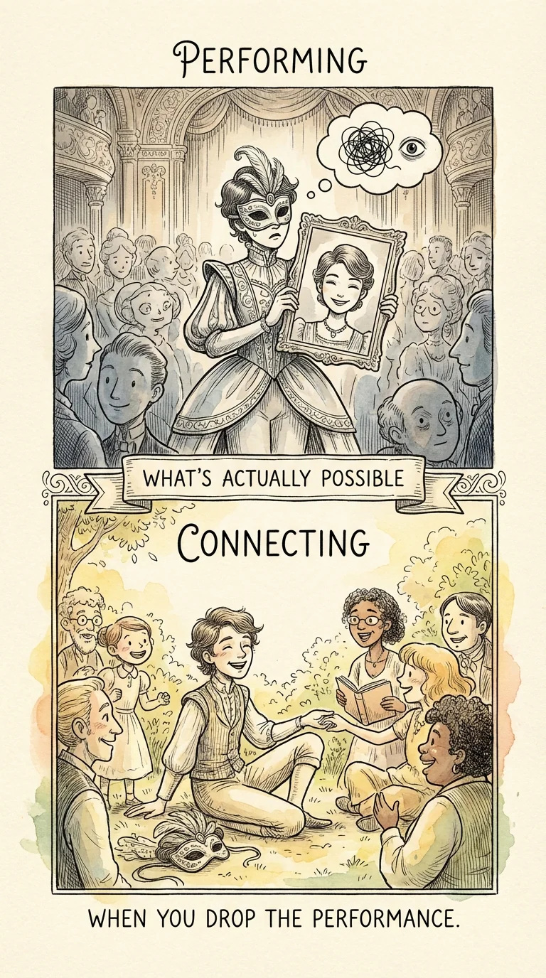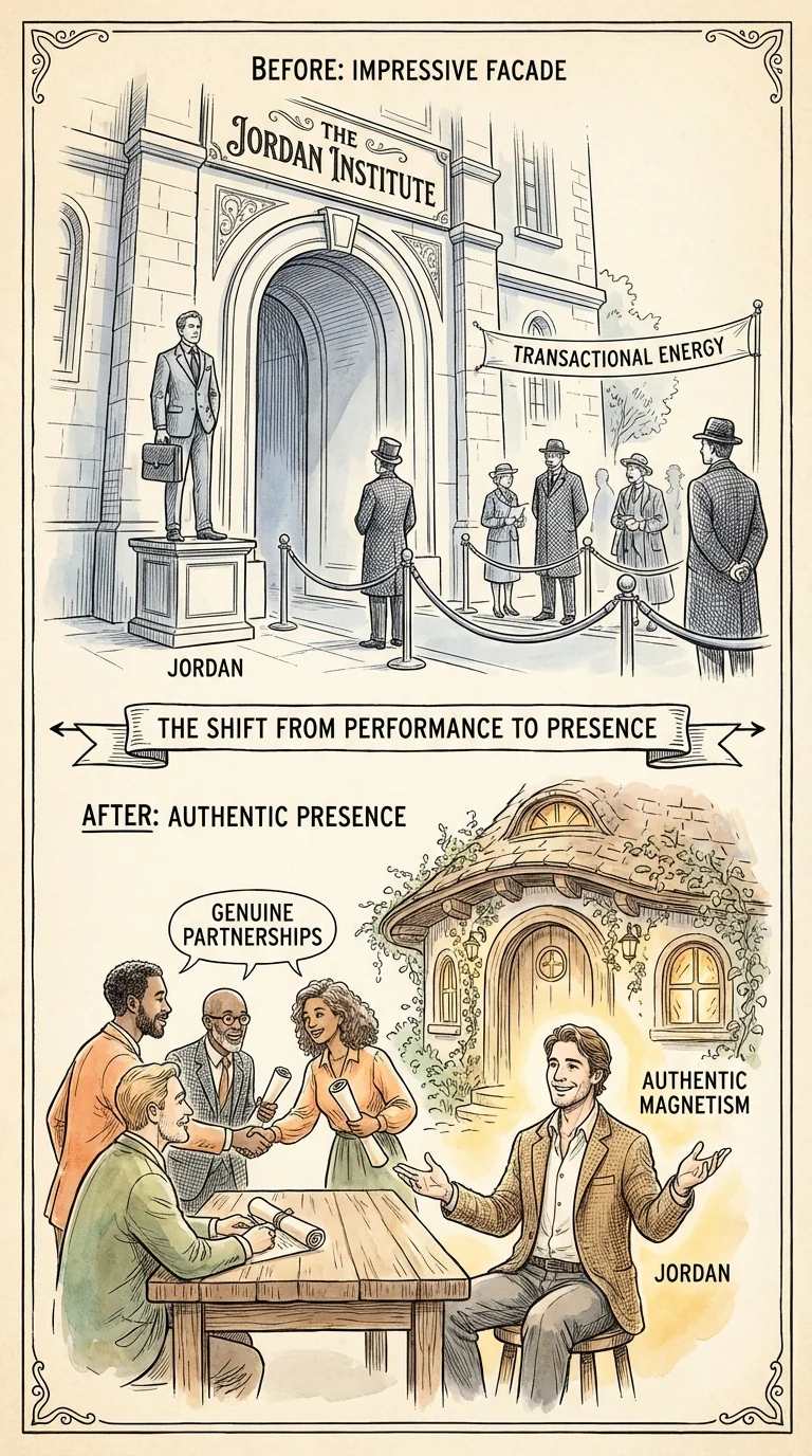 From performance to presence—the shift: Performance asks: 'How do I seem? Am I impressive enough?' Presence asks: 'Am I here? Am I connecting?' The shift: From managing impression to offering authenticity, from proving worth to being real, from seeming confident to being actual. The paradox: Dropping the performance actually makes you more magnetic. Not less. Because authenticity is magnetic. Perfection is boring and unapproachable. Vulnerability with competence is magnetic. Character story: Jordan's networking discovery. Used to network by highlighting only achievements, curating impressive image. Result: Transactional connections, no real relationships, exhausting. The shift: Added authentic humanity. 'Business is growing, but challenging.' 'Figuring some things out.' Asked genuine advice. Result: Deeper relationships, more collaboration, people wanted to help because he was real. His insight: 'Perfection is boring. Vulnerability with competence is magnetic.'