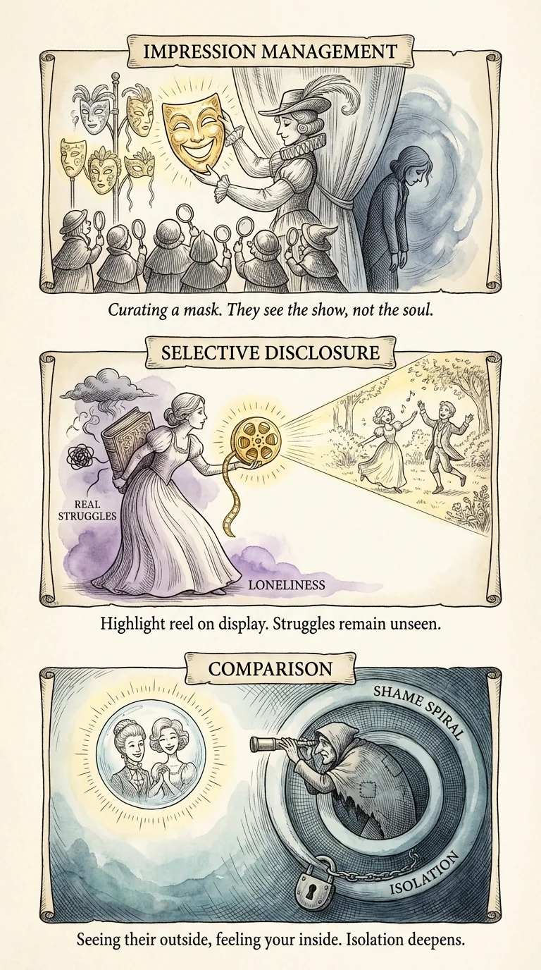 What kills connection: Impression management—carefully curating what you share to seem impressive. Result: People meet your performance, not you. No real bond forms. Selective disclosure—only sharing wins, hiding struggles. Result: Looks perfect, feels lonely. Others can't relate. Comparing your inside to others' outside—they have it together, you're a mess. Result: Isolation. You hide your truth. Connection becomes impossible.