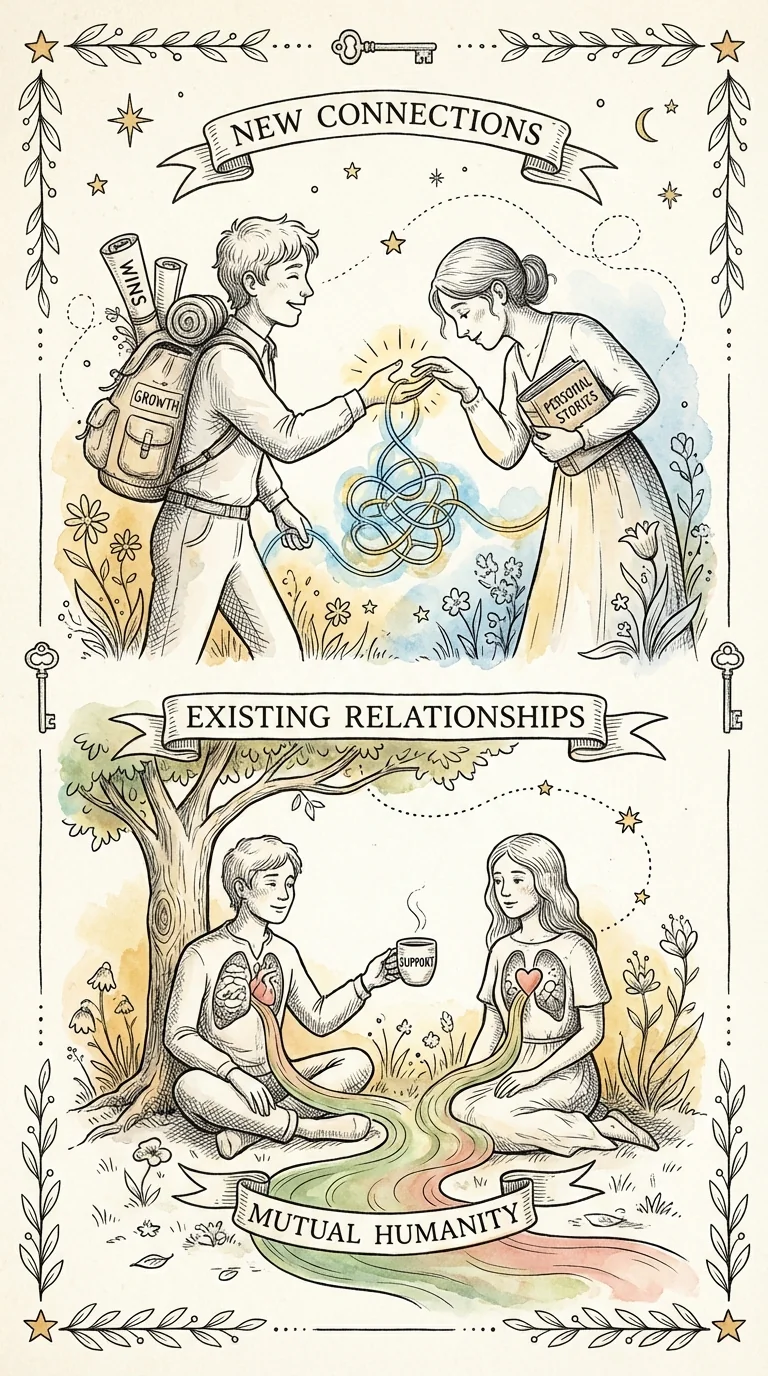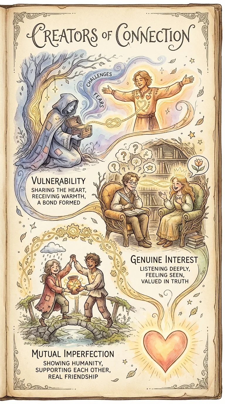 What creates connection: Appropriate vulnerability—sharing not just wins but challenges. 'I'm working on this and it's harder than I expected.' 'I'm learning as I go.' 'I don't have it figured out.' Result: Others can relate. They share struggles. Real bond forms. Genuine interest—shifting from 'How do I seem?' to 'Who are they?' Asking real questions, listening fully, being curious. Result: They feel seen. You're present. Mutual imperfection—both showing humanity. Friend shares struggle, you don't problem-solve, you relate. Result: Connection through shared humanity.