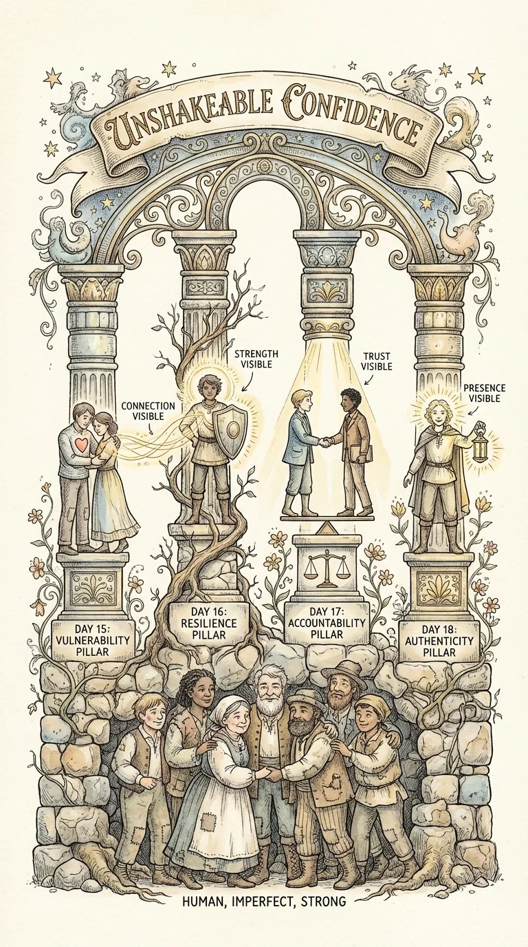 Notice what's happened across Day 15-18: Day 15—you learned vulnerability builds connection. Day 16—rejection builds resilience. Day 17—apologies build trust. Day 18—authenticity builds presence. Four days of mastery showing you that everything you feared (imperfection, rejection, mistakes, being human) is actually what creates the strongest confidence. Not despite your humanity. Because of it. Your imperfect authenticity is your greatest asset. Not something to hide. Something to offer.
