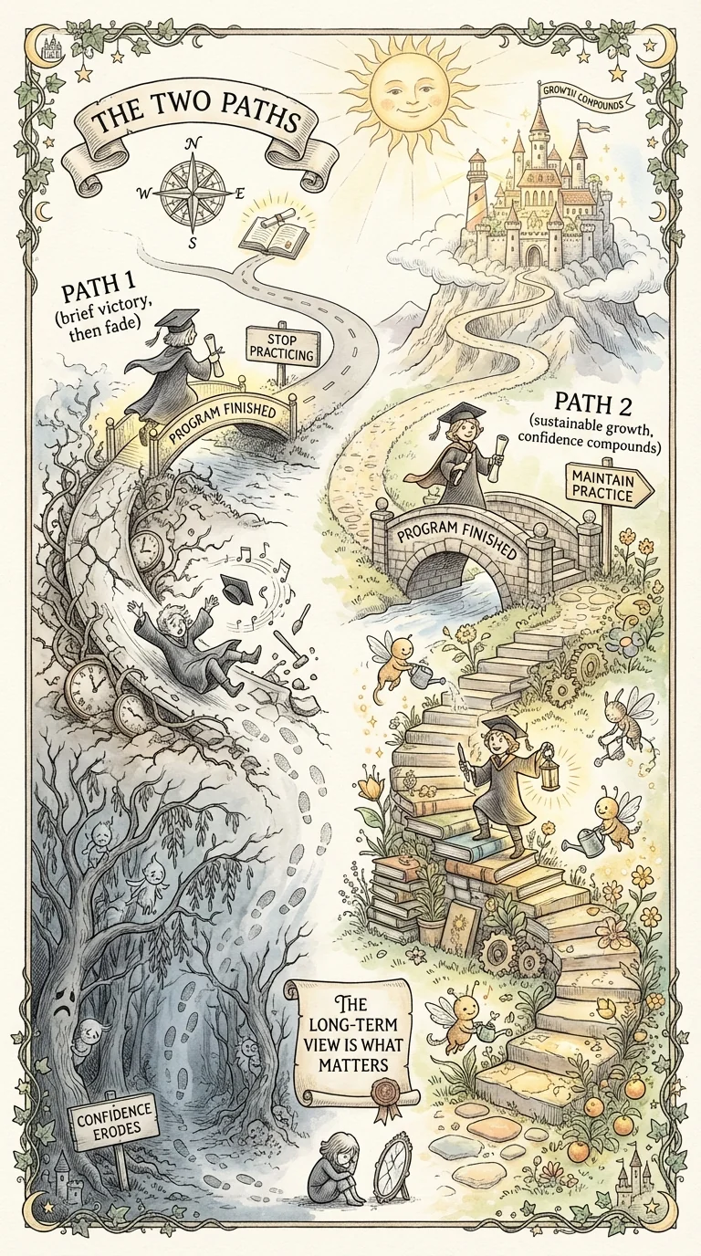 Here's the reality most programs won't tell you: Completing 21 days is amazing. But confidence isn't 'fixed' at Day 21. Confidence requires ongoing practice. Setbacks will happen. Old patterns will sometimes resurface. Maintenance is part of the process. This isn't failure—it's reality. The difference between people who sustain growth and people who slide back? The maintenance plan. The mindset. The commitment to practice beyond the program. This day teaches you to build your own system—because lasting confidence comes from sustainable practice, not from finishing a course.