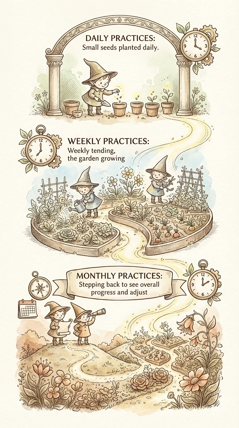 The maintenance mindset: Don't think: 'Once I finish, I'm done.' Think: 'I'm building a practice that continues.' Analogy: Physical fitness doesn't end when you finish a program. The program taught you HOW to maintain fitness long-term. Same with confidence. The 21 days taught you the skills, psychology, and practices. Now you learn to maintain them. Daily practices (5-10 minutes): Morning confidence check-in, 5-second rule practice, self-compassion moment, active listening reminder, evening reflection. Choose 2-3 that resonate. Weekly practices (15-30 minutes): Social challenge, progress review, connection time, tool refresh. Monthly practices (30-60 minutes): Big picture assessment, adjust and refine, celebrate progress, update goals.