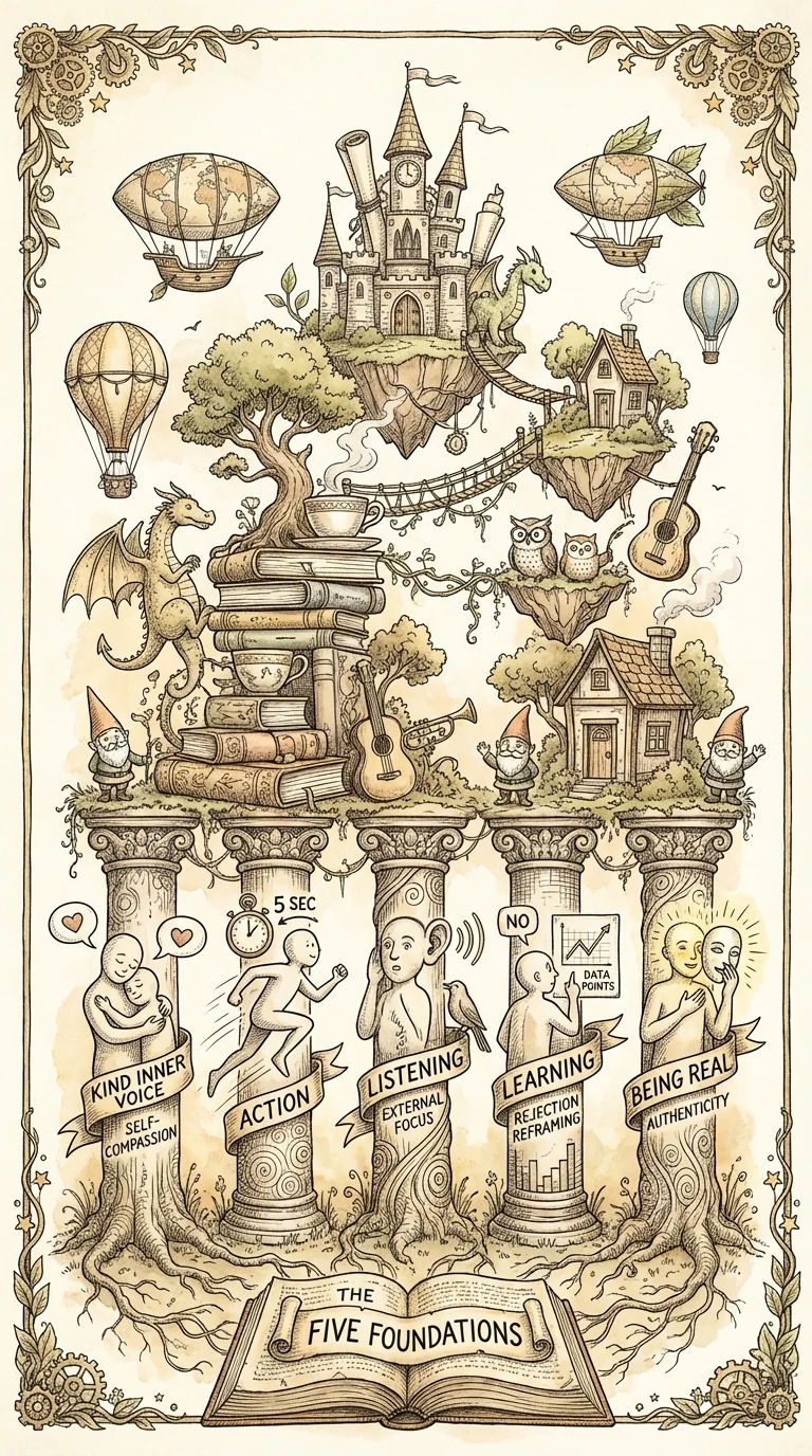 The 80/20 principle: If you only remember 20% of this program, make it these five principles (they cover 80% of sustainable confidence): 1) Self-compassion—treat yourself like you'd treat a good friend. 2) Action over overthinking—5-4-3-2-1-GO. Act before fear builds. 3) External focus—active listening reduces anxiety and improves connection. 4) Rejection as data—not about worth, just about fit. 5) Authenticity over performance—real connection requires real you. These five principles are your foundation forever. Everything else builds on them. Part 2 teaches you to implement your maintenance system immediately.