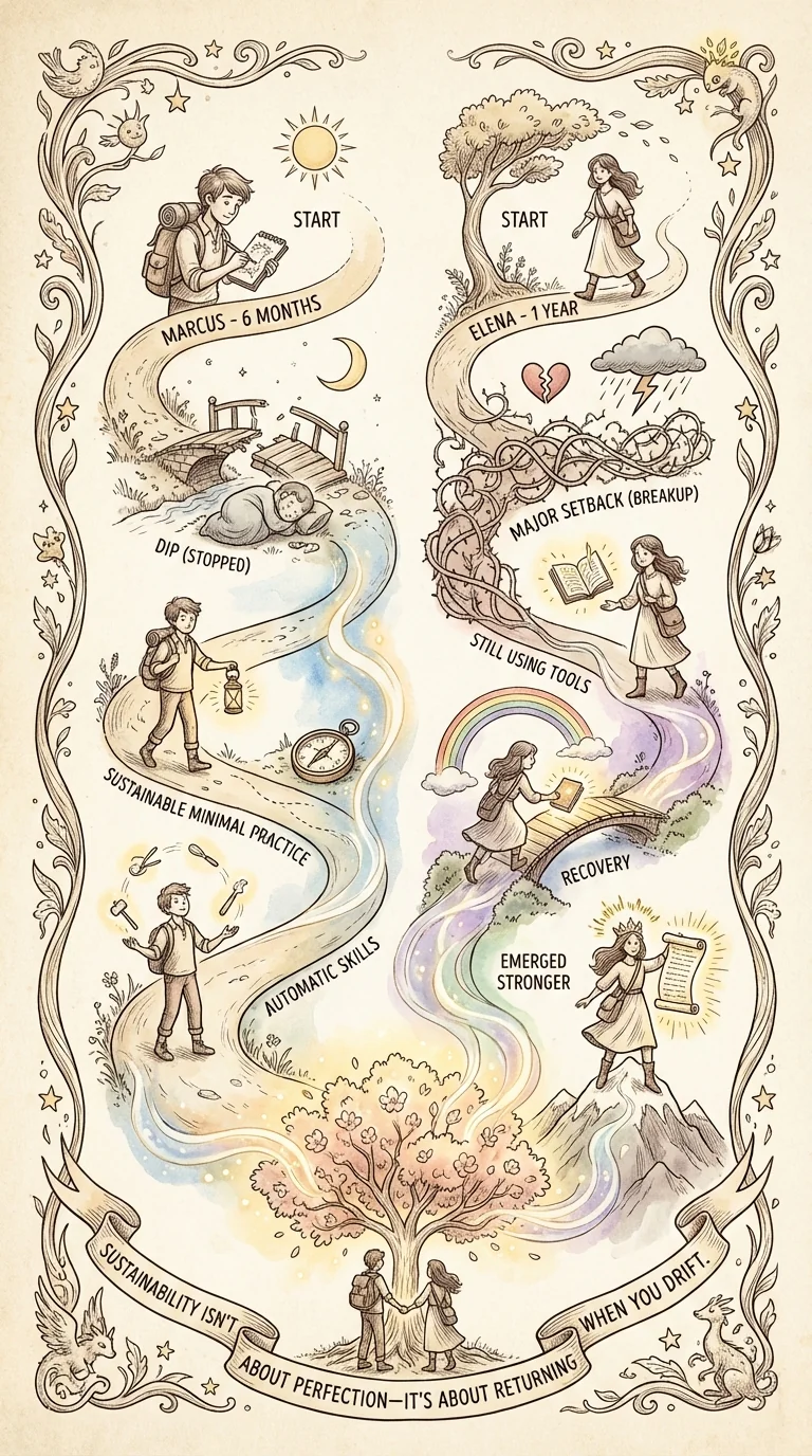 Real stories of long-term maintenance: Marcus, 6 months later: 'First month after program, I practiced daily. Then life got busy, I stopped for two weeks. Confidence noticeably dropped. I restarted with just one thing: weekly review + one social challenge per week. That was enough. Now it's been 6 months. Some skills automatic (active listening, 5-second rule). Others I still practice intentionally (boundary-setting, handling rejection). Key learning: I don't need EVERYTHING daily. But I need SOMETHING consistently.' Elena, 1 year later: 'I went through rough breakup 8 months after program. Confidence tanked. Felt like back at Day 1. But when I looked at my journal, I was still using tools. Handling situation better than old-me would. Just needed perspective. Doubled down on self-compassion and vulnerability. Within a month, stable again. Even stronger. Key: Setbacks aren't failure. They're part of journey.'