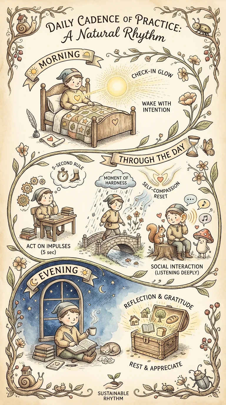 Your daily practice options (choose 1-2): 1) Morning confidence check-in (1-2 minutes): Self-compassion moment, one social intention for day. 2) The 5-second rule (throughout day): Use it at least once, act before overthinking. 3) Self-compassion moment (when harsh talk arises): Reframe, ask 'What would I tell a friend?' 4) Active listening (in one conversation): Full external focus, ask follow-up questions, reflect feelings. 5) Evening reflection (2 minutes): What went well? What did I learn? What am I proud of? These are simple, quick, but powerful. Which two feel most important to you?