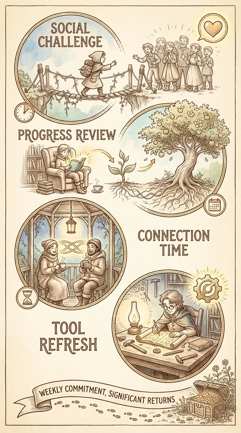 Your weekly practice (15-30 minutes): 1) Social challenge—one situation slightly outside comfort zone, uses graduated exposure, track what you try. 2) Progress review—what skills did I practice? What progress? What's next? 3) Connection time—reach out to one person, deepen one relationship, practice authentic connection. 4) Tool refresh—re-read one day's lesson, reinforce specific skill, adjust based on what's working. Pick one or two. Schedule it like an appointment. Make it non-negotiable. This 15-30 minutes weekly compounds dramatically over months.