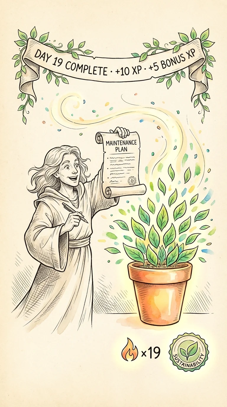 DAY 19 COMPLETE · +10 XP. Your terracotta plant now has 19 glowing leaves—the plant is now substantially lush, a beautiful symbol of 19 days of consistent practice. The banner reads: 'DAY 19 COMPLETE · +10 XP · +5 BONUS XP.' Below: 'Maintenance plan created · Sustainability unlocked · Streak: 🔥 x19 · TOMORROW: Confidence Through Contribution →' Two days remain. You've built your system for sustainable practice. Now you complete the final teachings. You're so close. The plant is thriving. Keep going.