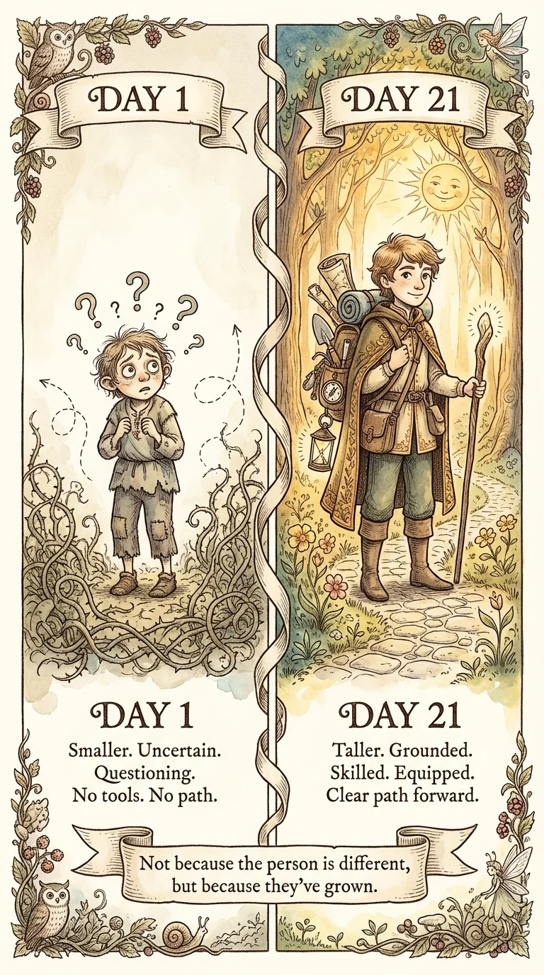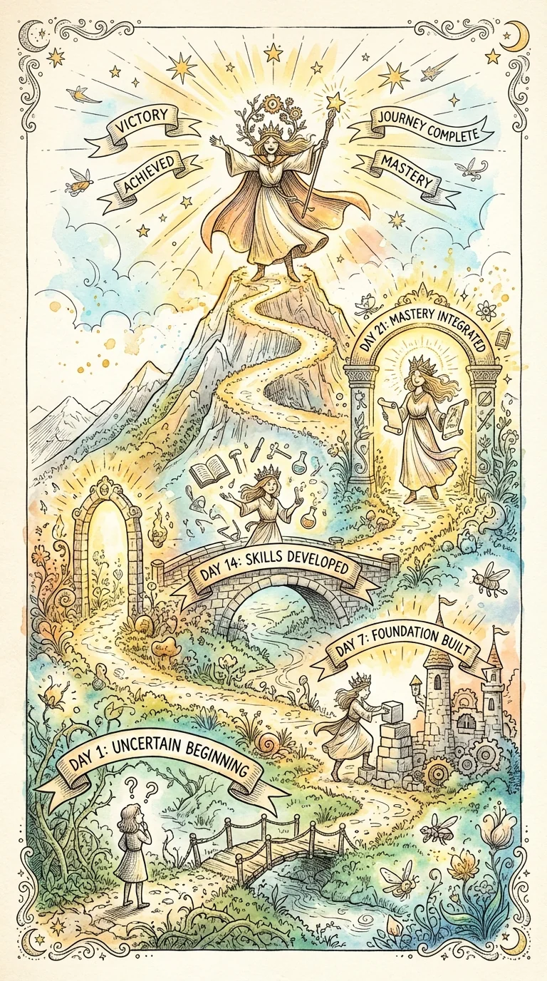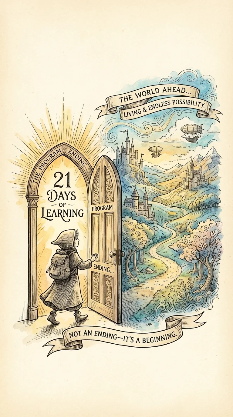 You completed the journey. 21 consecutive days. 21 days of showing up. 21 days of learning. 21 days of trying things that felt uncomfortable. 21 days of building skills. 21 days of proving to yourself you can grow. This is not a small accomplishment. This is real. And today you acknowledge it fully. Because what you've done is rare. Most people don't commit to growth. Most people don't show up consistently. Most people don't face their discomfort. But you did. And that matters.