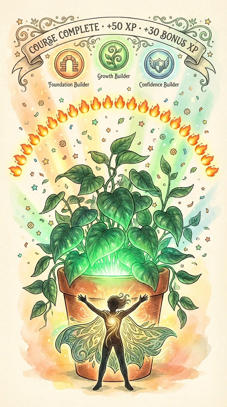 COURSE COMPLETE · +50 XP · FINAL CELEBRATION. Your terracotta plant now has 21 glowing leaves—FULLY LUSH, THRIVING, BEAUTIFUL. A living symbol of 21 days of consistent growth and transformation. The banner reads: 'COURSE COMPLETE · +50 XP · +30 BONUS XP = 80 XP TOTAL.' Below: '🏆 CONFIDENCE BUILDER BADGE 🏆' 'Foundation Builder ✓' 'Growth Builder ✓' 'Confidence Builder ✓' 'All badges earned' 'Streak: 🔥 x21 · 21 consecutive days complete' 'TOTAL XP EARNED: 315+ XP' 'Journey: Complete. Practice: Continues. Your adventure: Just beginning. The plant is fully mature. You are fully transformed. Go live it. 🌱💪🎉'